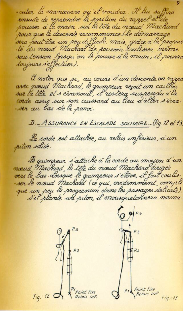 Les deux schémas de sa lettre sont reproduits ici.. Serge cite également les tests qu’il avait faits de son nœud, seul en descendant en rappel par cinq fois le toit de l’Hermite et en le remontant, et avec ses compagnons de cordée dont François Guillot dans l’hyper-Calanque et la Machine à laver, les réactions positives et encourageantes de François Guillot, Gilbert Garrigou, François-Régis Raybaud, Maurice Ramond et d’autres le traitant de fou «suicidaire ».